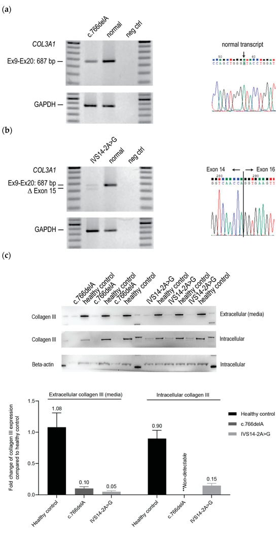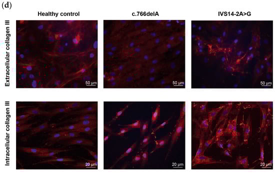 The expression of COL3A1 and GAPDH as a housekeeping transcript in both patient fibroblast lines was assessed using RT-PCR. The patient cell line carrying the c.766delA mutation showed lower levels of COL3A1 expression compared to healthy control cells (Figure 1a). Furthermore, only the normal transcript sequence was detected by Sanger sequencing of the amplicon generated by RT-PCR, suggesting very efficient nonsense-mediated decay of the transcript carrying the c.766delA mutation (Figure 1a). This observation suggested that the c.766delA frameshift exerts an effect through a haploinsufficiency mechanism. On the other hand, the patient cells carrying the intronic mutation, IVS14-2A>G, showed in-frame exon 15 skipping (54 bp) upon RNA analysis (Figure 1b); hence, implying a dominant negative disease mechanism. We assessed the intracellular and extracellular content of collagen III produced by both patient-derived cells relative to that from the healthy control donor. Generally, collagen deposition into the ECM only occurs in macromolecular-crowded (MMC) conditions. Hence, we could differentiate intracellular collagen III, the secreted form, and that incorporated into ECM. Both patient-derived cell lines express low levels of intracellular collagen III and secreted lower levels of collagen III than healthy control cells, as determined by western blotting (Figure 1c). Subsequently, intracellular collagen III and ECM deposition were assessed by immunofluorescence on patient and healthy control cell cultures to evaluate the assembly of collagen III. Intracellular collagen III staining in fibroblasts carrying the c.766delA mutation showed a slightly stronger intensity than the healthy control cells. The IVS14-2A>G fibroblasts showed patchy intracellular collagen III staining, suggesting accumulation and/or aggregation, compared to healthy control cells (Figure 1d).