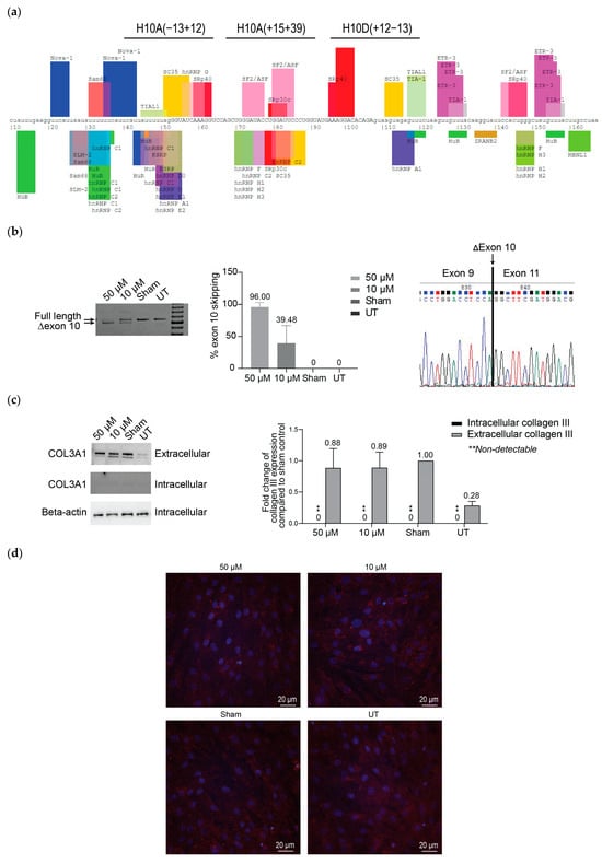 Assessment of COL3A1 exon 10 skipping and collagen III expression in patient fibroblasts carrying the COL3A1 c.766delA mutation. (a) The exon 10 map indicates the ASO target sites and the exon-splicing enhancer and silencer motifs predicted by Splice Aid. Uppercase letters indicate exonic nucleotides and lowercase letters intronic nucleotides. The image is adapted from the original Splice Aid output (http://www.introni.it/splicing.html, accessed on 19 March 2024). (b) RT-PCR analysis of COL3A1 mRNA across exons 1–14. (c) Western blot analysis of intracellular and secreted collagen III protein. Collagen III is detected at top band; ~140 kDa, however, the presence of lower band is likely a non-specific band due to prolonged image exposure. (d) Immunofluorescence staining of collagen III deposition, (confocal images) in patient fibroblast cultures, transfected with the exon-skipping PMO cocktail [COL3A1_H10A(+15+39) and COL3A1_H10D(+12−13)] at 50 µM and 10 µM for four days. The bar graphs show average values from three independent transfections (n = 3, error bar = SD). Red: collagen III. Blue: nuclei.