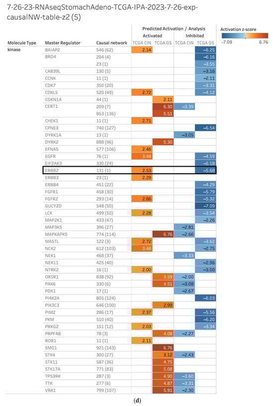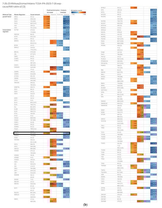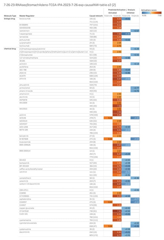 Data on intestinal- and diffuse-type GC from the TCGA cBioPortal for Cancer Genomics were uploaded and analyzed using Ingenuity Pathway Analysis (IPA) (https://digitalinsights.qiagen.com, accessed on 6 August 2024) (QIAGEN Digital Insights, Aarhus C, Denmark) []. The 1099 causal networks in diffuse- and intestinal-type GC were generated by filtering with a cut-off z-score absolute value of 2 (As of July 2023).