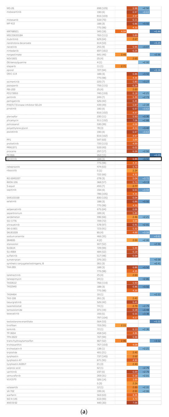 Lenvatinib, pyrotinib, HDAC1, mir-196, and ERBB2 have been identified as master regulators of causal networks in diffuse- and intestinal-type GC in the analysis. Since diffuse-type GC has relatively stable genomic features, the development of targeting therapies has been challenging []. The combination of focal adhesion kinase inhibitor and mitogen-activated protein kinase (MAPK) kinase inhibitor was effective in inhibiting the tumor growth of human diffuse-type GC xenograft []. Lenvatinib, a multi-kinase inhibitor to inhibit vascular endothelial growth factor receptor (VEGFR), fibroblast growth factor receptor (FGFR), platelet-derived growth factor receptor (PDGFR) alpha, KIT, and rearranged during transfection (RET), showed an effect in the progression-free survival and response rate in patients with radioiodine-refractory thyroid cancer []. Pyrotinib is an inhibitor of EGFR (ERBB1) and HER2/4 (ERBB2/4), which is approved for the treatment of breast cancer in China []. Since both lenvatinib- and pyrotinib-oriented causal networks in diffuse-type GC were activated, it may also be targeted in the treatment of diffuse-type GC. The effects of the combination therapy with sorafenib and lenvatinib were limited in hepatocellular carcinoma. Careful examination in terms of drug resistance and effectiveness is required [].