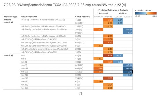 The causal network of mir-196, a master regulator of the network, was activated in intestinal-type GC and inactivated in diffuse-type GC. Inhibitor of growth family member 5 (ING5), a class II tumor suppressor, is translationally targeted by miR-196, miR-196a, miR-196b-5p, miR-193a-3p, and miR-27-3p []. ING5 promotes the autoacetylation of p53 and histone H3 and H4 to induce the transcription of Bax, growth arrest and DNA damage-inducible 45 (GADD45), p21, and p27 []. miRNAs are involved in linking obesity and cancer []. The investigation of miRNA–miRNA and miRNA–long non-coding RNA interaction revealed the link between PPARgamma cell signaling regulated by miR-130, miR-4663, miR-375, miR-494-3p, and miR-128-3p and MAPK cell signaling regulated by miR-143, miR-375, miR-196, and miR-128-3p []. miR-196 is overexpressed in the intestinal epithelium of Crohn’s disease patients, for which the relationship between cancer and Crohn’s disease is unknown []. miR-196 is upregulated in pancreatic cancer cells and activates the AKT signaling pathway, which is involved in the development of type 2 diabetes []. The expression level of miR-196b was higher in pancreatic cancer cells than in cancer stroma, and the high expression of miR-196b decreased the overall survival rate, which suggested the role of miR-196b as a prognosis biomarker for pancreatic cancer []. The relationship between miRNAs and causal networks may need to be further elucidated to reveal the malignancy.