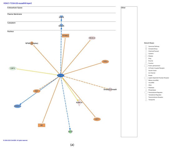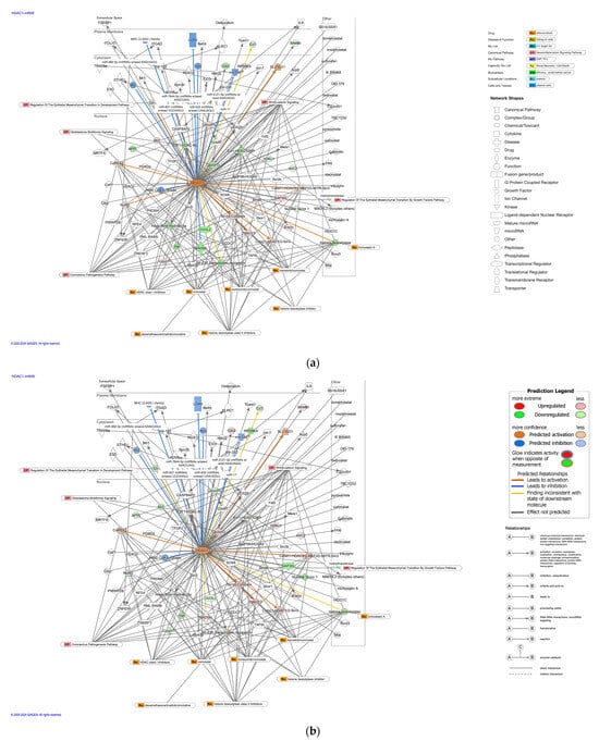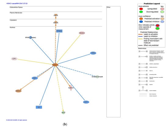 The analysis of the HDAC1-interacting network identified the involvement of the regulation of EMT by the growth factors pathway, coronavirus pathogenesis pathway, and vorinostat. (a) The HDAC1-interacting network in diffuse-type GC; (b) the HDAC1-interacting network in intestinal-type GC. Pale red or green color indicates upregulated or downregulated gene expression, respectively. Orange or blue color indicates predicted activation or inhibition, respectively. The intensity of colors indicates the degree of up- or downregulation. A solid or dashed line indicates direct or indirect interaction, respectively. (Original images are available in the Supplementary Materials as Figures S1 and S2).