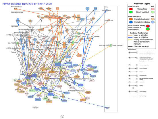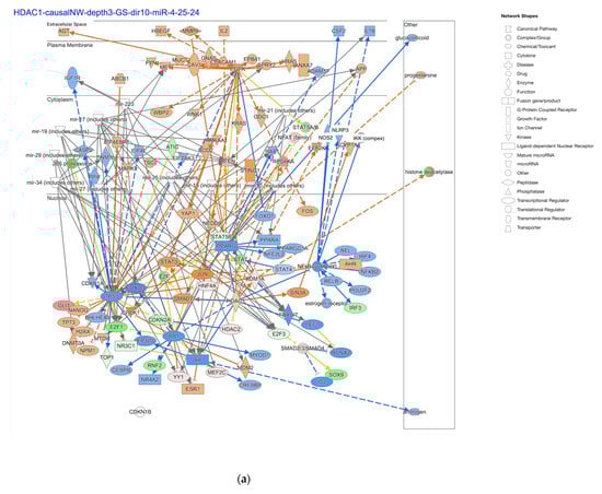 The HDAC1-regulated causal network with depth three had RNA–RNA interactions with microRNAs such as mir-10, mir-15, mir-17, mir-19, mir-21, mir-223, mir-25, mir-27, mir-29, and mir-34. (a) The regulators of the HDAC1-regulated causal network with depth three in diffuse-type GC are shown; (b) the regulators of the HDAC1-regulated causal network with depth three in intestinal-type GC are shown. Pale red or green color indicates upregulated or downregulated gene expression, respectively. Orange or blue color indicates predicted activation or inhibition, respectively. The intensity of colors indicates the degree of up- or downregulation. A solid or dashed line indicates direct or indirect interaction, respectively. (Original images are available in the Supplementary Materials as Figures S3 and S4).