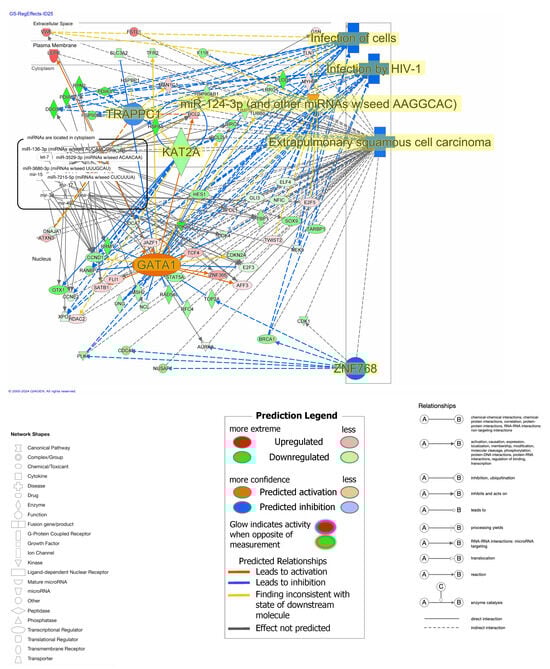The regulator effect networks of diffuse-type GC included infection of cells (Figure 5). The infection of cells, infection by HIV-1, and extrapulmonary squamous cell carcinoma were the main functions related to the network. Trafficking protein particle complex subunit 2 (TRAPPC1), lysine acetyltransferase 2A (KAT2A), and zinc finger protein 768 (ZNF768) were inactivated, while GATA binding protein 1 (GATA1) was activated in the network (Figure 5). The network had a direct relationship between 10 microRNAs, including let-7, mir-15, mir-17, mir-34, mir-8, mir-497, miR-136-3p (miRNAs w/seed AUCAUCG), miR-3529-3p (miRNAs w/seed ACAACAA), miR-3680-3p (miRNAs w/seed UUUGCAU), and miR-7215-5p (miRNAs w/seed CUCUUUA) (Table 2).