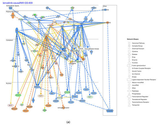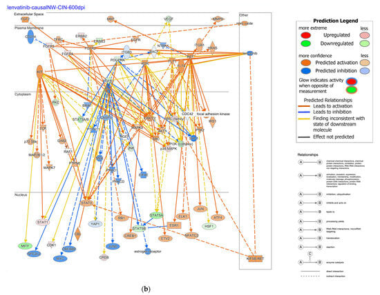 Causal networks of lenvatinib in diffuse- and intestinal-type GC. (a) The causal network (depth three) of lenvatinib in diffuse-type GC; (b) the causal network (depth three) of lenvatinib in intestinal-type GC. Pale red or green color indicates upregulated or downregulated gene expression, respectively. Orange or blue color indicates predicted activation or inhibition, respectively. The intensity of colors indicates the degree of up- or downregulation. A solid or dashed line indicates direct or indirect interaction, respectively. (Original images are available in the Supplementary Materials as Figures S5 and S6).