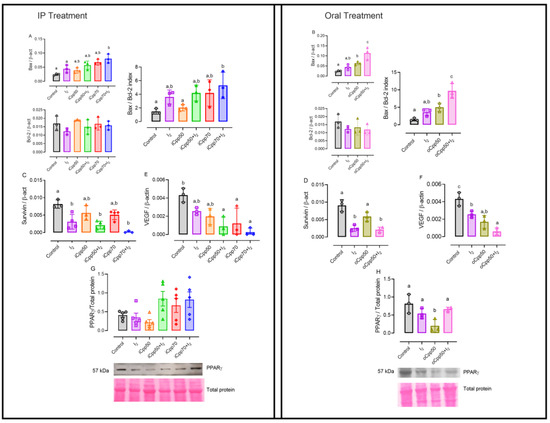 Molecular responses after 3 weeks of treatment. Expression (quantitative PCR) in tumoral samples from intraperitoneal (IP) or oral treatment. Apoptosis (A,B), chemoresistance (C,D), and angiogenesis (E,F). Immunodetection of peroxisome proliferator-activated receptor gamma (PPARγ) was analyzed by Western blotting. Expression was normalized by Ponceau staining and analyzed by band densitometry (G,H). Bax, bcl-2-like protein 4; Bcl-2, B-cell lymphoma 2; VEGF, vascular endothelial growth factor. Graphs representing mean ± SD. Data were analyzed using variance analysis (ANOVA) and Tukey post hoc test. Different letters indicate statistical differences (p < 0.05). n = 3–5/group.