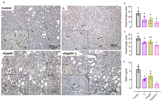 To analyze the effect of oCpp50 and I2 administration on tumoral vascularity, the number and length of the blood vessels [(immunodetected by the cluster of differentiation 34 (CD34)], as well as the VEGF protein content, were quantified. Decreases in all parameters accompanied all conditions (Figure 3); however, the co-administration (oCpp50 + I2) exhibited the lowest values, suggesting the cancelation of new blood vessel formation.