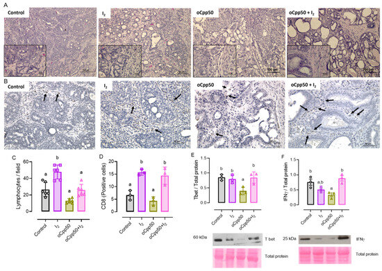 Figure 4 shows representative micrographs and the quantification of immune responses. Figure 4A shows micrographs stained with hematoxylin-eosin (H&E, 20X); the insert shows (40X) the lymphocytes (hyperpigmented cells). Figure 4B shows micrographs showing CD8-positive immune cells (black arrows). The quantification analysis (Figure 4C,D) showed that I2 increased the presence of both lymphocytes and CD8+ cells in the interior of the tumor compared with both the control and oCpp50 groups, indicating that I2 induces the activation of cytotoxic immune responses. The protein content of Tbet and IFNγ (Figure 4E,F) did not change in the I2 groups, but in the oCpp50 group, these markers exhibited a significant decrease, which was restored by the combination of oCpp50 + I2.