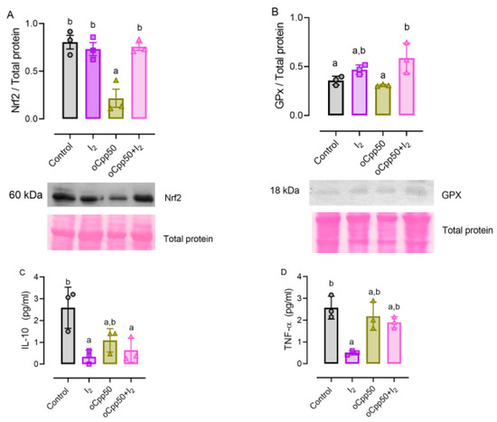 To evaluate the antioxidant mechanism involved in I2 action, the expression of nuclear erythroid factor 2 (Nrf2) and its antioxidant effector, the glutathione peroxidase (GPx), were analyzed. Figure 5A shows that I2 administration alone or with oCpp50 did not modify the Nrf2 expression but the GPx expression increased in both groups (Figure 5B). In contrast, the control and oCpp50 groups did not exhibit changes in these parameters. The interleukin 10 (IL-10) and tumor necrosis factor-alpha (TNFα) were inhibited by the presence of I2, corroborating the anti-inflammatory effect of this halide (Figure 5C, D).