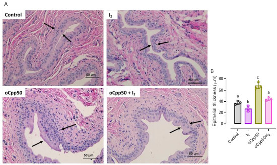 I2 supplementation prevents bladder inflammation associated with oCpp. (A): micrographs stained with H&E of bladder epithelium (40X). Black arrows signalized the epithelial thickness, which was associated with inflammation: (B): quantitation of the thickness of the urothelium. The graph represents means ± SD. Data were analyzed using ANOVA and Tukey post hoc tests. Different letters indicate statistical differences (p < 0.05). n = 3/group.