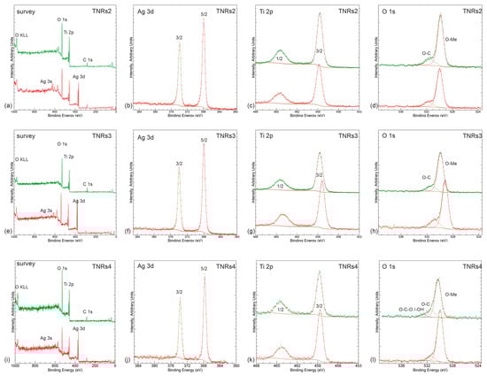 Results of XPS examination represented by wide survey scans and narrow high-resolution spectra for Ag 3d, Ti 2p, and O 1s regions obtained for TNRs 2 (panels (a–d)), TNRs 3 (panels (e–h)), and TNRs 4 (panels (i–l)) samples. For details, see the text. Green and red lines represent TNRs and TNRs modified with Ag, respectively.