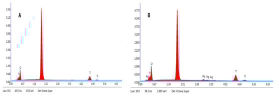 Chemical composition of the TNRs 2 (A) and TNRs 2 Ag (B) using energy-dispersive X-ray spectroscopy (EDX).