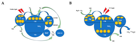 Proposed mechanism for the photocatalysis of RhB in the presence of TNRs modified with Ag under (A) visible and (B) UV light.