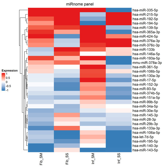 Heatmap of expression levels of miRNAs with dysregulated expression between inflammatory stenosis submucosa (Inf_SM), inflammatory stenosis subserosa (Inf_SS), fibrostenosis submucosa (Fib_SM) and fibrostenosis subserosa (Fib_SS). The red color indicates higher expression levels and the blue color indicates lower miRNA expression levels.