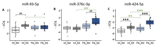 Expression of miRNA with profibrotic effects in Crohn’s disease with inflammatory stenosis (Inf) or fibrostenosis (Fib). (A) Box-plot with individual −ΔCq value representation of hsa-miR-93-5p expression in Inf_SM (white), Inf_SS (grey), Fib_SM (light blue) and Fib_SM (dark blue). (B) Box-plot with individual −ΔCq value representation of hsa-miR-376c-3p expression in Inf_SM (white), Inf_SS (grey), Fib_SM (light blue) and Fib_SM (dark blue). (C) Box-plot with individual −ΔCq value representation of hsa-miR-424-5p expression in Inf_SM (white), Inf_SS (grey), Fib_SM (light blue) and Fib_SM (dark blue). Statistical analysis: Black asterisks represent significant differences calculated using the paired sample t-test (***—p < 0.001). The green asterisks represent significant differences calculated using the independent sample t-test (**—p < 0.01, ***—p < 0.001). Black hash marks represent significant differences calculated using the Wilcoxon signed-rank test (##—p < 0.01). The green hash marks represent significant differences calculated using the Mann–Whitney U test (#—p < 0.05, ###—p < 0.001). Legend: Fib—fibrostenosis, Inf—inflammatory stenosis, SM—submucosal layer, SS—subserosal layer.