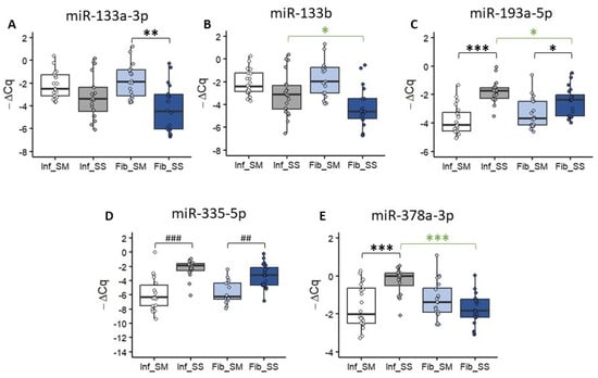 Expression of miRNAs with fibroprotective effects in Crohn’s disease with inflammatory stenosis (Inf) or fibrostenosis (Fib). (A) Box-plot with individual −ΔCq value representation of hsa-miR-133a-3p expression in Inf_SM (white), Inf_SS (grey), Fib_SM (light blue) and Fib_SM (dark blue). (B) Box-plot with individual −ΔCq value representation of hsa-miR-133b expression in Inf_SM (white), Inf_SS (grey), Fib_SM (light blue) and Fib_SM (dark blue). (C) Box-plot with individual −ΔCq value representation of hsa-miR-193a-5p expression in Inf_SM (white), Inf_SS (grey), Fib_SM (light blue) and Fib_SM (dark blue). (D) Box-plot with individual −ΔCq value representation of hsa-miR-335-5p expression in Inf_SM (white), Inf_SS (grey), Fib_SM (light blue) and Fib_SM (dark blue). (E) Box-plot with individual −ΔCq value representation of hsa-miR-378a-3p expression in Inf_SM (white), Inf_SS (grey), Fib_SM (light blue) and Fib_SM (dark blue). Statistical analysis: Black asterisks represent significant differences calculated using the paired sample t-test (*—p < 0.05, **—p < 0.01, ***—p < 0.001). The green asterisks represent significant differences calculated using the independent sample t-test (*—p < 0.05, ***—p < 0.001). Black hash marks represent significant differences calculated using the Wilcoxon signed-rank test (##—p < 0.01, ###—p < 0.001). Legend: Fib—fibrostenosis, Inf—inflammatory stenosis, SM—submucosal layer, SS—subserosal layer.