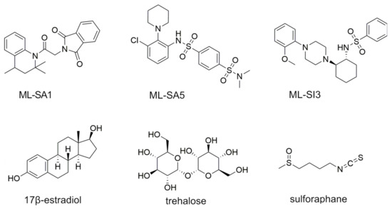 - Rühl, P.; Rosato, A.S.; Urban, N.; Gerndt, S.; Tang, R.; Abrahamian, C.; Leser, C.; Sheng, J.; Jha, A.; Vollmer, G.; et al. Estradiol analogs attenuate autophagy, cell migration and invasion by direct and selective inhibition of TRPML1, independent of estrogen receptors. Sci. Rep. 2021, 11, 8313. [Google Scholar] [CrossRef]