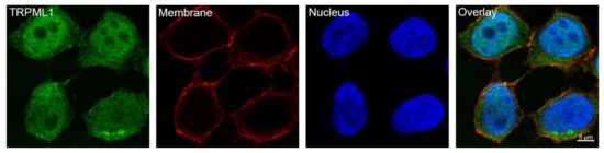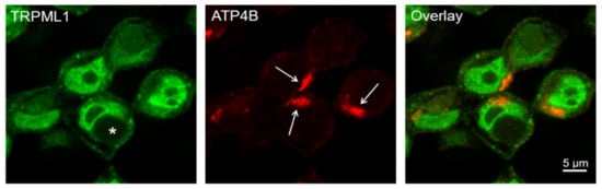 3.1. HGT-1 Cells Localize TRPML1 in or around the Cell Nucleus