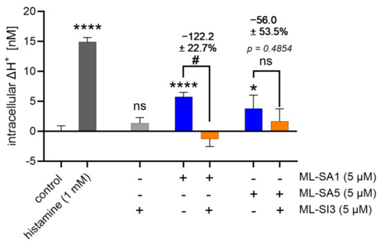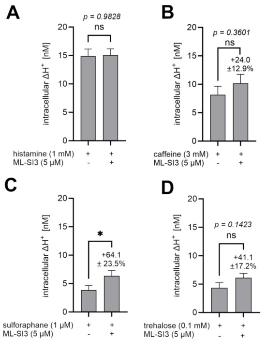 2.8. ML-SI3 Did Not Reduce the Proton Secretion Induced by Histamine, Caffeine, Trehalose, and Sulforaphane