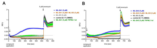2.3. TRPML1 Activation Leads to Increased Cytosolic Ca2+ Concentrations
