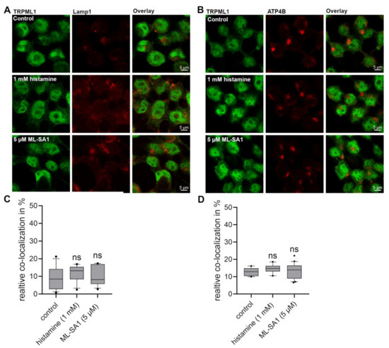2.6. No Difference in the Co-Localization of TRPML1 with Lamp-1 and H+/K+-ATPase Could Be Detected in HGT-1 Cells after Exposure to Histamine and ML-SA1