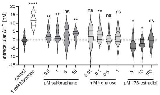 2.7. The Potential TRPML1 Activity Modulators Sulforaphane, Trehalose, and 17β-Estradiol Impact Proton Secretion in HGT-1 Cells