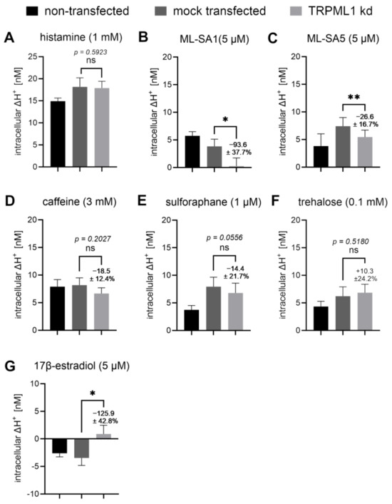 2.10. Proton Secretion Induced by ML-SA1 and ML-SA5 Was Reduced in TRPML1 Knock-Down (kd) Cells