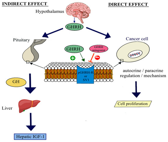 Growth hormone-releasing hormone (GHRH) is a peptide neurohormone secreted by the hypothalamus. Generally, it is known to act on the pituitary gland to stimulate the production and release of growth hormone (GH) through its binding to GHRH receptors (GHRH-R) [1,2,3,4,5,6,7]. In addition to this endocrine role, the biological actions of this 44-amino acid peptide are not limited to the pituitary–hypothalamic axis, since it was demonstrated that GHRH can function as an autocrine/paracrine growth factor in various extrapituitary tissues and several human cancers [1,2,3,4,5,6,7]. The presence of the mRNA of GHRH was detected in human prostate, breast, ovarian, endometrial, pancreatic and adrenal cancers [4] and cancer cell lines derived from breast, endometrial, ovarian, prostatic, pancreatic, gastric, colorectal, lung and brain tissues, and bone sarcomas, lymphomas and renal-cell carcinomas [1,4,5,6,7,8,9,10,11]. The hormonal activities of GHRH and its analogs are mediated by the full-length pituitary type GHRH receptor (pGHRH-R) [1,3,4]. However, previous investigations have also identified splice variants (SVs) of GHRH-Rs in human cancers and other extrapituitary tissues that can mediate the effects of GHRH and its agonistic and antagonistic analogs [1,4,5,6,7,8,9,10,11] (Figure 1).