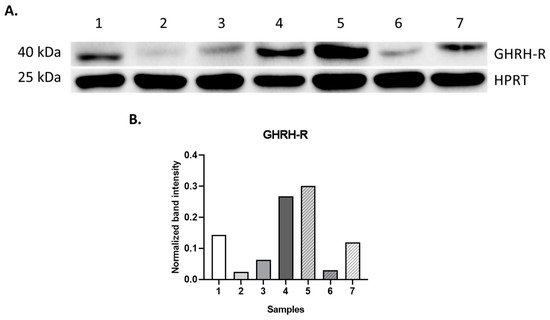 Pediatric tissue samples were homogenized and lysed in ice-cold protein lysis buffer (M-PER, Thermo Fisher Scientific, Waltham, MA, USA), which was supplemented with protease and phosphatase inhibitors (Sigma-Aldrich, St. Louis, MO, USA). The Bradford assay was applied for protein quantification. Before Western blotting, proteins were diluted with 4× Laemmli buffer (1610747, Bio-Rad Laboratories, Irvine, CA, USA) and 40 μg of each protein sample in equal volumes were denatured at 95 °C for 8 min. Afterwards, protein lysates were separated on a 10% sodium dodecyl sulfate-polyacrylamide gel by electrophoresis (SDS-PAGE). To define the size of the separated proteins, using Precision Plus Dual Color Protein Standard as molecular weight marker (1610374, Bio-Rad Laboratories, Irvine, CA, USA) was also loaded on the SDS-PAGE. Then, proteins were transferred to a polyvinylidene fluoride (PVDF) membrane (Millipore, Burlington, MA, USA). Non-specific binding sites were blocked with 5% milk-TBS-Tween, followed by the incubation of the membranes with the following primary antibodies overnight, at 4 °C: anti-GHRH-R antibody (1:1000 dilution, GHRH-R polyclonal antibody: PA3-117, Thermo Fisher Scientific, Waltham, MA, USA) and anti-HPRT antibody (1:1000 dilution, P00492 rabbit monoclonal; Biol. Technology, Carlsbad, CA, USA). HPRT as a housekeeping protein was measured to ensure equal loading of all samples. After extensive washing steps with TBS-Tween, membranes were incubated with anti-rabbit IgG secondary antibody (1:5000, Thermo Fisher Scientific, Waltham, MA, USA—diluted in 5% skin milk in TBS-Tween) for two hours at room temperature. Then, after washing membranes with TBS-Tween several times, the signal was detected by chemiluminescence using Clarity Western ECL Substrate (Bio-Rad Laboratories, Hercules, CA, USA). The intensity of each band was normalized to HPRT. Quantification was carried out using the Bio-Rad Image Lab 5.2.1 software (Bio-Rad Laboratories, Hercules, CA, USA).