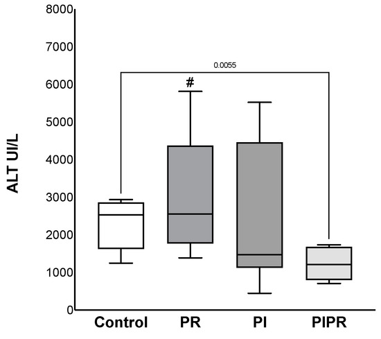 ALT dosages of the four groups: Control, treated with ascorbic acid before ischaemia (PI), treated before reperfusion (PR), and treated both before ischaemia and before reperfusion (PIPR). # p < 0.05 compared to PIPR. Statistical analysis was performed using unpaired Student’s t-test.