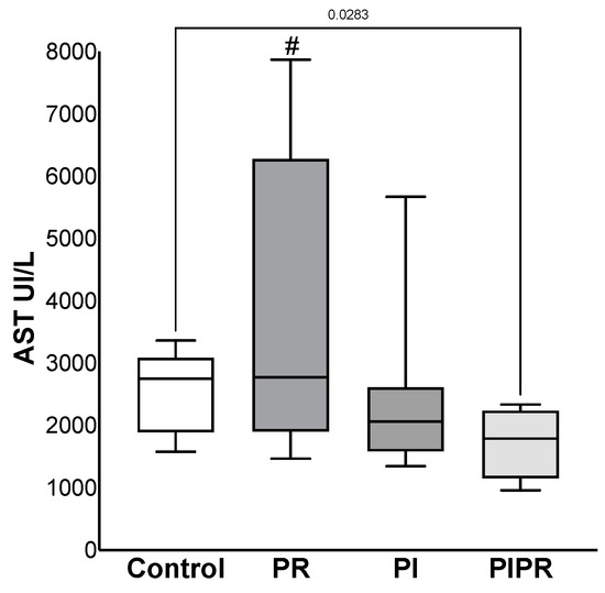 The transaminase dosages were less elevated in ALT in the PIPR group (1227 ± 420 UI/L) than in the C (2300 ± 686 UI/L), p = 0.005 and PR groups (3001 ± 1576 UI/L), p = 0.01. A similar effect was not observed when we compared PIPR with the PI group (2341 ± 1907 UI/L), p > 0.05. Furthermore, there were no significant changes in the other comparisons (p > 0.05). The AST dosage was also lower in the PIPR group (1715 ± 576 UI/L) than in the C (2541 ± 677 UI/L) (p = 0.028) and PR groups (3874 ± 2388 UI/L) (p = 0.026); there were no significant changes in comparison with the PI group (2437 ± 1412 UI/L) and the other comparisons (p > 0.05). The data are shown in Figure 1 and Figure 2.