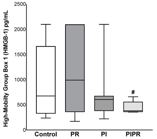 High-mobility group box-1 (HMGB-1) dosages of the four groups: Control, treated with ascorbic acid before ischaemia (PI), treated before reperfusion (PR), and treated both before ischaemia and before reperfusion (PIPR). # p < 0.05 compared to PR. Statistical analysis was performed using unpaired Student’s t-test.