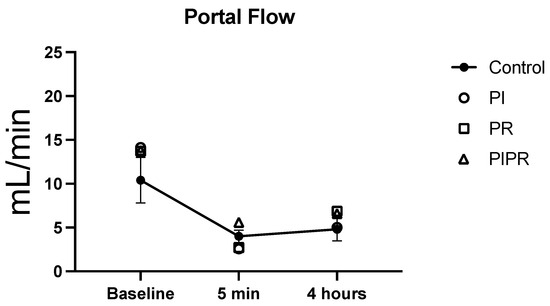 When we focused on the portal flows at each time period within the same group, we noted a significant reduction in portal flow after 5 min of reperfusion compared with the baseline value (p < 0.01 in the C, PI, and PR groups; p = 0.02 in the PIPR group). Animals in the PI and PR groups exhibited a significant increase in portal flow after 4 h of reperfusion compared with after 5 min (p = 0.01); the animals in the C and PIPR groups did not exhibit a significant increase (p = 0.26 and p = 0.42, respectively). After 4 h of reperfusion, the animals in all of the groups exhibited significantly lower portal flow than the baseline values (p < 0.01 for the C, PI, and PR groups; p = 0.02 for the PIPR group). These data are summarised in Figure 4.