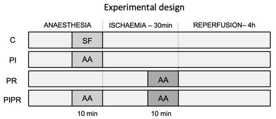 This study was approved by the University of Sao Paulo School of Medicine’s Ethics Committee on the Use of Animals (No. 1436/2020). A total of 36 male Wistar rats (Rattus novergicus albinus) weighing between 250 and 300 g were anaesthetised and exposed to 30 min of hepatic ischaemia and 4 h of reperfusion. The rats were then randomised into four groups of eight animals each: a control (C) group received an intravenous saline solution; a pre-ischaemia (PI) group received a full dose of AA at 100 mg/kg 10 min before ischaemia; a pre-reperfusion (PR) group received a full dose of AA 10 min before reperfusion; and a pre-ischaemia and pre-reperfusion (PIPR) group received half a dose of AA (i.e., 50 mg/kg) 10 min before ischaemia and the other half 10 min before reperfusion. The experimental design of the study is outlined in Figure 6. The selected dose was determined based on existing pharmacokinetic data [40] and prior animal studies [16,17,19,20].