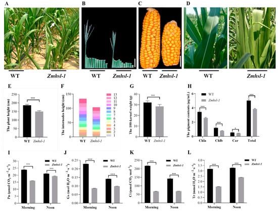 When grown in the field at the silking stage, the Zmhsl-1 plants exhibited significantly reduced plant height, which was attributable to the reduced node length despite the number of nodes that remained unaltered relative to Z58 (Figure 1B,E,F). Likewise, Zmhsl-1 plants were also featured, with significantly shorter ear length, lower one hundred-kernel weight, smaller ear diameter, lower row number per ear, and lower kernel number per row in comparison with Z58 at the harvest stage (Figure 1C,G and Figure S3A–D). Moreover, the leaf colour of Zmhsl-1 was lighter than Z58, which was corroborated by the reductions in the contents of chlorophyll a, chlorophyll b, carotenoids, and total pigments in Zmhsl-1 leaves (Figure 1D,H). Conceivably, photosynthesis (Pn), stomatal conductance (Gs), internal CO2 concentration (Ci), and transpiration rate (Tr) in Zmhsl-1 were all significantly lower than in wild-type plants (Figure 1I–L).