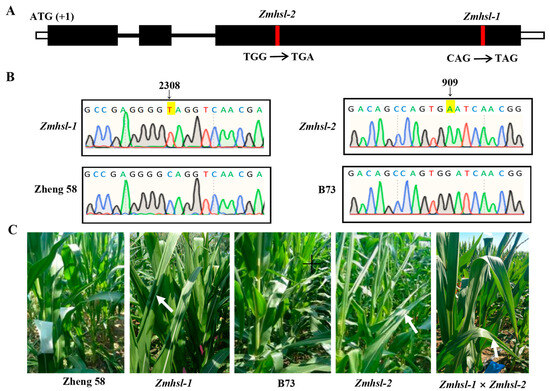 The Zmhsl-1 mutant was isolated from Z58 mutant lines generated by EMS. The mutant Zmhsl-2 in B73 background was ordered from the MEMD library (http://elabcaas.cn/memd/public/index.html#/pages/search/geneid accessed on 25 October 2018) [54].