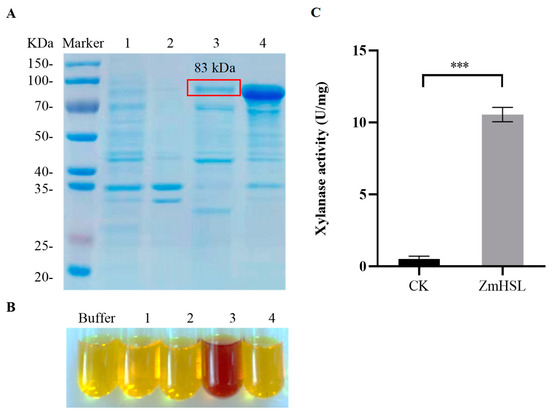 Determination of ZmHSL xylanase activity. (A) SDS-PAGE electrophoresis picture of ZmHSL expressed protein. (B) Xylanase activity of ZmHSL protein was determined by 3,5-dinitrosalicylic acid. (C) Xylanase activity of ZmHSL and control; the error bars represent ± SE (n = 3), t-test (***, p < 0.001). The numbers “1, 2, 3, and 4” in (A,B) represent pET-28a(+) unloaded supernatant, pET-28a(+) unloaded precipitate, pET-28a(+)-ZmHSL supernatant, and pET-28a(+)-ZmHSL precipitate.