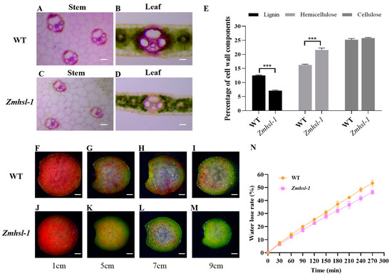 Comparison of cell wall components and water transport between wild-type and Zmhsl-1 plants. (A–D) Lignin staining of cross-sections of stems and leaves from wild-type and Zmhsl-1 plants. (A,C) Bar = 0.1 mm, (B,D) Bar = 0.2 mm. (E) Determination of cell wall components in wild-type and Zmhsl-1 plants. (F–M) Cross-section staining observations at 1 cm, 5 cm, 7 cm, and 9 cm above the stained end of a stem in wild-type and Zmhsl-1 plants. (N) The detached leaf water loss rates of wild-type and Zmhsl-1 plants at indicated time. t-test (*** p < 0.001).