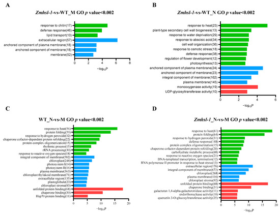 GO enrichment analysis of wild-type and Zmhsl-1 plants. (A) GO enrichment analysis of DEGs between wild type and Zmhsl-1 at 24 °C (in the morning). (B) GO enrichment analysis of DEGs between wild type and Zmhsl-1 at 34 °C (at noon). (C) GO enrichment analysis of DEGs in wild-type plants between morning and noon. (D) GO enrichment analysis of DEGs in Zmhsl-1 between morning and noon. The M in the picture refers to “morning” with an ambient temperature of about 24 °C, and N refers to “noon” with an ambient temperature of about 34 °C.