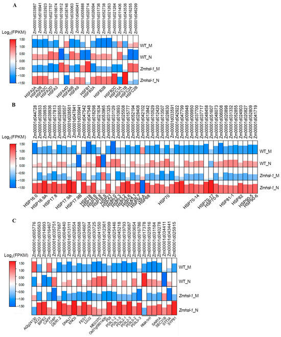 Heat shock transcription factors (HSFs) and their regulated heat shock proteins (HSPs) play important roles in plants responding to high-temperature stress and withstanding the damages caused by high temperature. Using mining and analysis of HSF- and HSP-related genes in the transcriptome data, a total of 20 HSF- and 46 HSP-related genes were found to be DEGs, most of which were upregulated by high temperature induction, and the expression levels in Zmhsl-1 were higher than those in wild-type plants (Figure 6A,B).