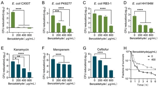 The bactericidal activity of antibiotics against pathogens is reduced by the presence of benzaldehyde. (A–D) Pre-culturing benzaldehyde with bacteria for 3 h resulted in a dose-dependent decrease in the effectiveness of ciprofloxacin against wild-type strains that are resistant to ciprofloxacin. (E–G) Benzaldehyde reduced the bactericidal activity of three bactericidal antibiotics (kanamycin, meropenem, and ceftiofur) against E. coli CX93T. (H) The minimum duration to achieve a 99% reduction in the bacterial population (MDK99) of ciprofloxacin against E. coli CX93T. All data obtained from biological experiments conducted in triplicate are reported as mean values with standard deviations (±SD). Statistical significance was determined using non-parametric one-way ANOVA, and the levels of significance were denoted as * p < 0.05, ** p < 0.01, *** p < 0.001, and **** p < 0.0001.