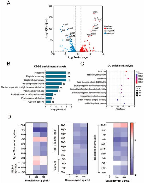 Transcriptome analysis of E. coli following exposure to benzaldehyde. (A) Volcano plot illustrating the differential expression of genes. The mRNA fold changes (Log2(FC)) in E. coli CX93T compared to E. coli CX93T treated with benzaldehyde, along with their corresponding significance values represented as log10 (p value). (B,C) Analysis of gene functional enrichment, including KEGG and GO enrichment; (D) RT-PCR results demonstrating the transcription levels of genes associated with bacterial flagella and chemotaxis.