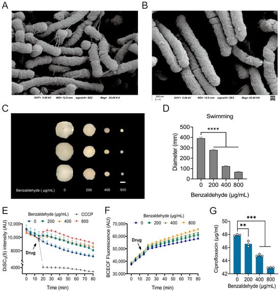 Benzaldehyde inhibits the formation of bacterial flagella and reduces intracellular antibiotic accumulation levels. (A,B) The surface morphology observed using scanning electron microscope in the absence (A) and presence (B) of benzaldehyde; (C,D) benzaldehyde inhibited swimming motility of E. coli CX93T in a dose dependent manner; (E,F) benzaldehyde dissipated the Δψ (E), while showed no effect on ΔpH; (G) benzaldehyde decreased the intracellular accumulation of ciprofloxacin. ** p < 0.01, *** p < 0.001, and **** p < 0.0001.