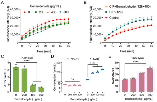 Benzaldehyde decelerates the TCA cycle and bacterial metabolism. (A) Benzaldehyde inhibited bacterial respiration; (B) the respiration rate increase induced through ciprofloxacin was inhibited by benzaldehyde; (C) benzaldehyde downregulated the intracellular ATP level. (D) Benzaldehyde increased the level of NAD+; (E) benzaldehyde increased the ratio of NAD+/NADH. The mean ± SD values presented in this study were derived from three separate experiments. Statistical analysis revealed no difference (ns p > 0.05) a highly significant difference (**** p < 0.0001).