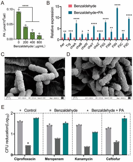 Pyruvate plays a critical role in benzaldehyde-induced tolerance. (A) The intracellular pyruvate concentration decreased in a manner dependent on the concentration of benzaldehyde; (B) the exogenous addition of pyruvate reversed the downregulation of genes related to bacterial flagella and chemotaxis caused by benzaldehyde; (C,D) the surface morphology of benzaldehyde-pretreated E. coli CX93T was examined using a scanning electron microscope in the presence (D) and absence (C) of pyruvate; (E) the exogenous addition of pyruvate successfully reinstated the bactericidal effect of antibiotics against benzaldehyde pretreated bacteria. The levels of significance were denoted as * p < 0.05, ** p < 0.01, *** p < 0.001, and **** p < 0.0001.