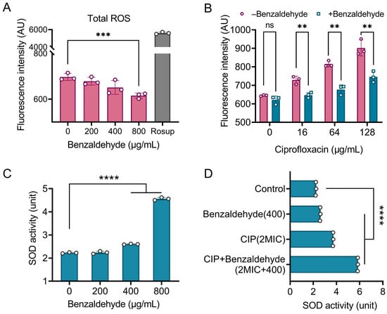 Benzaldehyde mitigates the oxidative damage caused by ciprofloxacin in bacteria. (A,B) The ROS level induced by benzaldehyde (A) or ciprofloxacin in combination with benzaldehyde (B); (C,D) the superoxide dismutase (SOD) activity under the treatment of benzaldehyde (C) or ciprofloxacin in combination with benzaldehyde (D). The levels of significance were denoted as ns p > 0.05, ** p < 0.01, *** p < 0.001, and **** p < 0.0001.