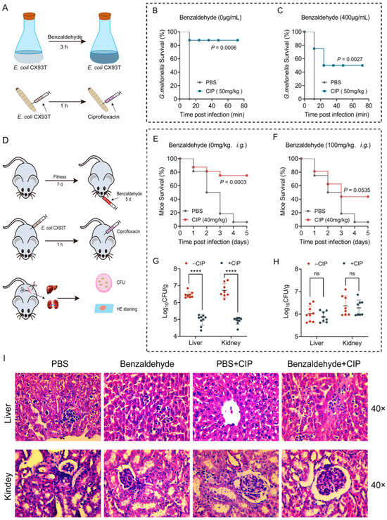 The in vivo effectiveness of ciprofloxacin is diminished upon administration of benzaldehyde. (A) Protocols for conducting experiments on the infection model of G. mellonella larvae. The survival rates of G. mellonella larvae (n = 12) infected with E. coli CX93T (105 CFUs) were evaluated following co-culturing without (B) and with benzaldehyde (400 μg/mL, (C)) for a duration of three hours, followed by treatment with a single dose of ciprofloxacin (50 mg/kg). (D) Design of the experimental procedures for inducing peritonitis-sepsis infection in mice. (E,F) The survival rate curve of mice (n = 12) that were pre-administered with either PBS (E) or benzaldehyde (100 mg/kg, (F)) for a consecutive period of 5 days is depicted. Subsequently, the mice were intraperitoneally infected with E. coli CX93T and treated with either PBS or ciprofloxacin (40 mg/kg). (G,H) The levels of bacteria in the liver and kidney of mice, which were administered with PBS (G) or benzaldehyde (100 mg/kg, (H)) before infection as previously mentioned. (I) The HE staining results of liver and kidney under various treatment conditions. The levels of significance were denoted as ns p > 0.05 and **** p < 0.0001.