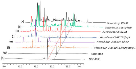 HPLC chromatograms of extracts from different strains: (a) wild-type Nocardia sp. CS682; (b) Nocardia sp. CS682/fnqO overexpression strain; (c) PKS deletion mutant Nocardia sp. CS682DR; (d) Nocardia sp. CS682DR/fnqO overexpression strain; (e) deletion mutant Nocardia sp. CS682DRΔfnqO; (f) complementation strain Nocardia sp. CS682DRΔfnqO/pNV18L2-fnqO; (g) purified compound NOC-IBR2 from Nocardia sp. CS682DR fnqO overexpression strain; and (h) purified compound NOC-IBR1 from the Nocardia sp. CS682DR fnqO overexpression strain.