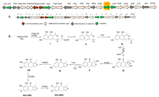 (A) Organization of the NOC-IBR1 and NOC-IBR2 biosynthesis-related gene clusters from Nocardia sp. CS682DR; the translational directions of the genes are indicated by arrows, and the letters above the arrows represent the gene names. (B) Proposed biosynthetic pathway for compounds NOC-IBR1 and NOC-IBR2, where FnqE1/E2/E3 are acyl carrier proteins (ACPs), FnqI is a Bayer–Villiger monooxygenase, and FnqA is an esterase. FnqGH = SnoaL-like domain protein and FAD oxidase; FnqJ = hydrolase. FnqBCD = ferredoxin, cytochrome P450, and flavin reductase, respectively; ThnM3 = methyltransferase. fnqO in the orange frame is the SARP gene.