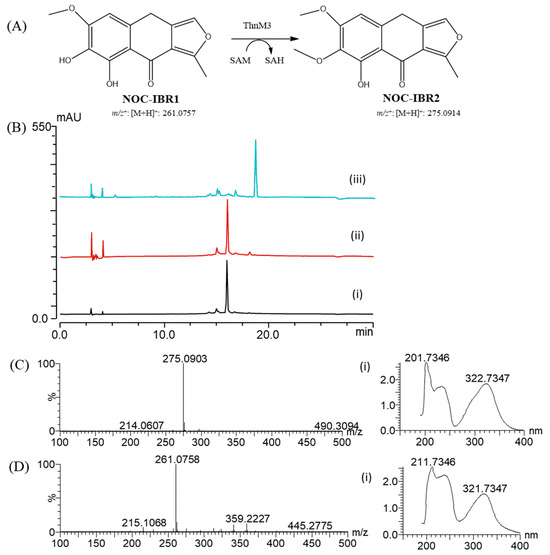 (A) Methylation of NOC-IBR1 by ThnM3 in the presence of SAM at 40 °C for 3 h (50 mM Tris HCl buffer (pH 8), 2 mM SAM, 2 mM substrate, and 50 µg of ThnM3 protein). (B) HPLC-PDA chromatogram analyses of (i) purified NOC-IBR1, (ii) the NOC-IBR1 enzyme with NarM, and (iii) the NOC-IBR1 enzyme with ThnM3 in the presence of SAM at 40 °C. (C) HQ-QTOF ESI/MS spectrum of the peak corresponding to NOC-IBR2 showing an m/z value of 275.0903 (error: 5 ppm). (C) (i) UV/VIS spectrum of NOC-IBR2. (D) HQ-QTOF ESI/MS spectrum of the peak corresponding to NOC-IBR1 showing an m/z value of 261.0758 (error: 0.03 ppm). (D) (i) UV/VIS of NOC-IBR1.